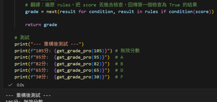 Python 實戰:拒絕麵條式代碼!用 Lambda + Next 重構成績評級系統; grade = next(result for condition, result in rules if condition(score))
