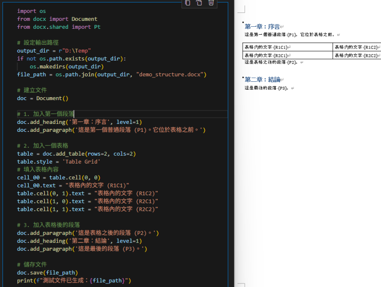 我們先用 Python 生成一個包含「段落」與「表格」交錯的複雜 Word 文件。