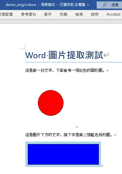 doc.add_paragraph('這是圖片下方的文字。接下來是第二張藍色矩形圖。')