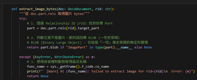 2. 丟進 `extract_image_bytes(doc, “rId1”)`。