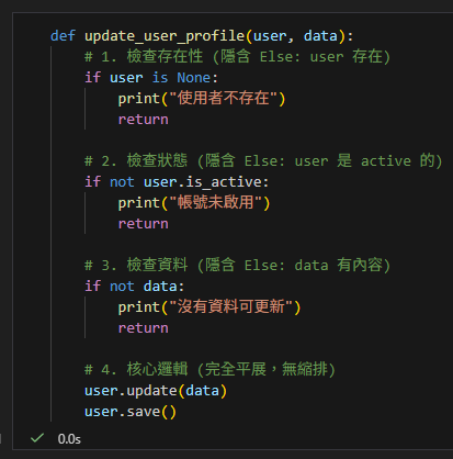 這是最經典的衛語句 (Guard Clause) 模式。把函數開頭視為「安檢門」,不合規定的直接請回,核心邏輯不需要包在 else 裡。