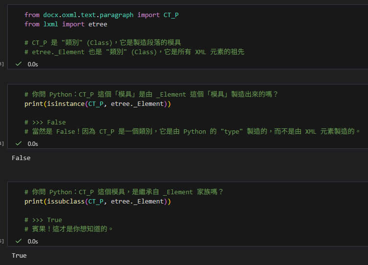 # 當然是 False!因為 CT_P 是一個類別,它是由 Python 的 "type" 製造的,而不是由 XML 元素製造的。✅ 正確解法 A:檢查繼承關係 (使用 issubclass)