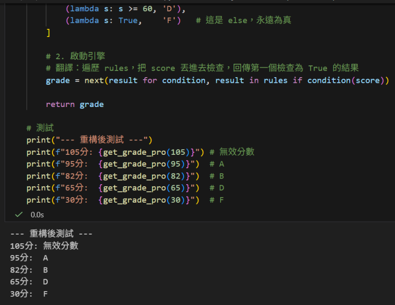 你可以看到我把 無效分數 的檢查也變成了一條規則,放在最上面。這讓「錯誤處理」也變成了規則的一部分,而不是一層醜陋的嵌套 if。