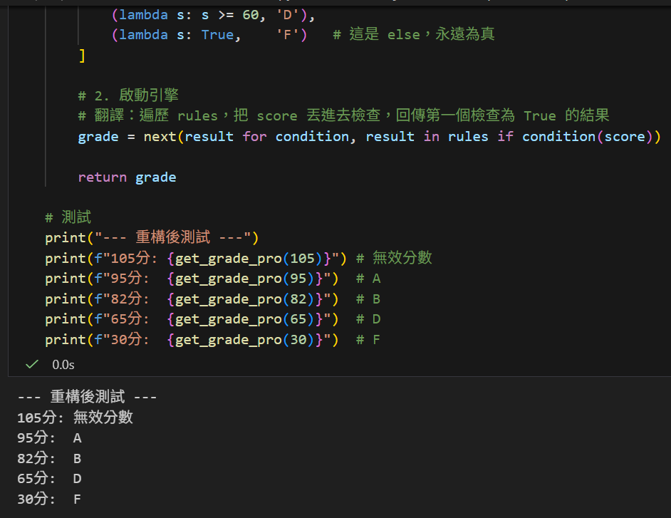 (lambda s: s >= 95, 'S'),完全不需要去動下面的 next(...) 核心邏輯。