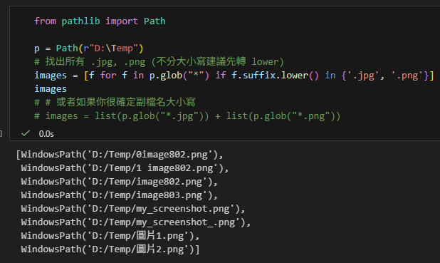 傳統的寫法可能需要寫很大一串,甚至還要想辦法處理副檔名大小寫的問題(.jpg vs .JPG)。其實,使用 pathlib 配合列表推導式(List Comprehension),一行程式碼就能優雅搞定!