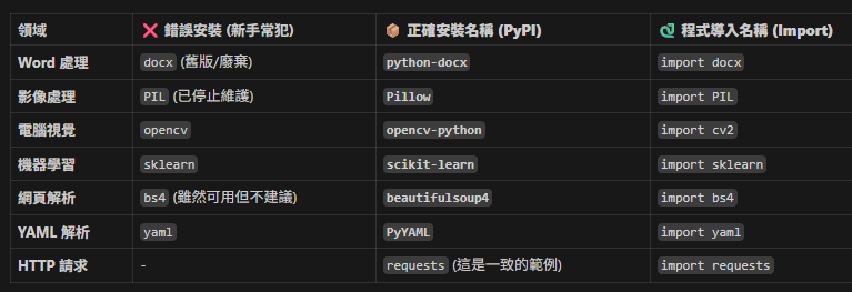 * **故事**:早在多年前,已經有人註冊了 `docx` 這個名字,但功能很陽春且早已停止維護。後來的新作者開發了功能強大的新版,但因為 `docx` 這個名字被佔用了,只好改名為 `python-docx` 上架。但為了讓大家寫程式時直覺(畢竟是在處理 docx),程式碼裡還是保留 `import docx` 的寫法。