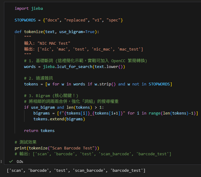 query_tokens = tokenize(user_query, use_bigram=False) # Query 通常不做 Bigram 以免過度發散