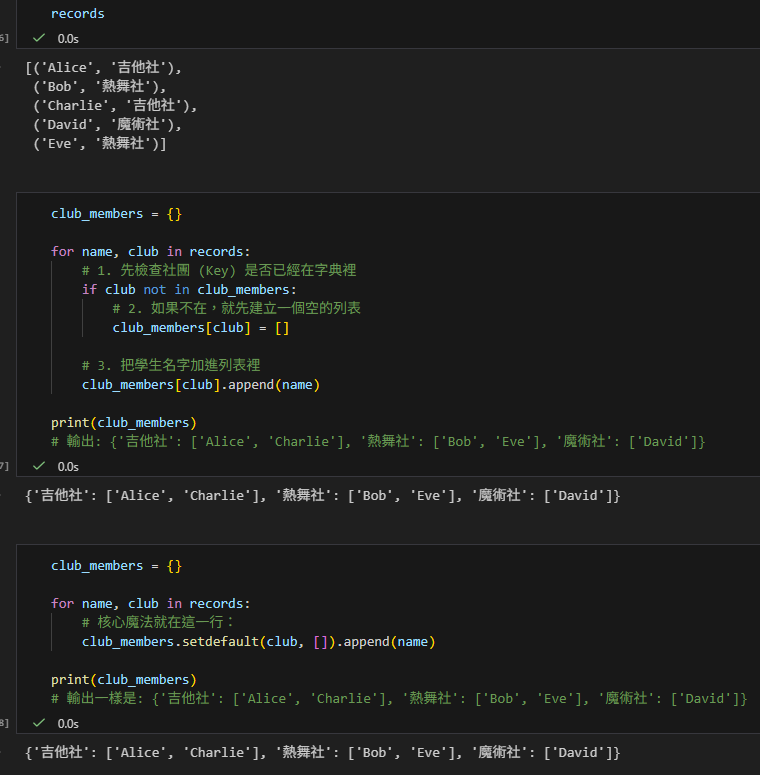# 輸出: {'吉他社': ['Alice', 'Charlie'], '熱舞社': ['Bob', 'Eve'], '魔術社': ['David']}這段程式碼完全正確,